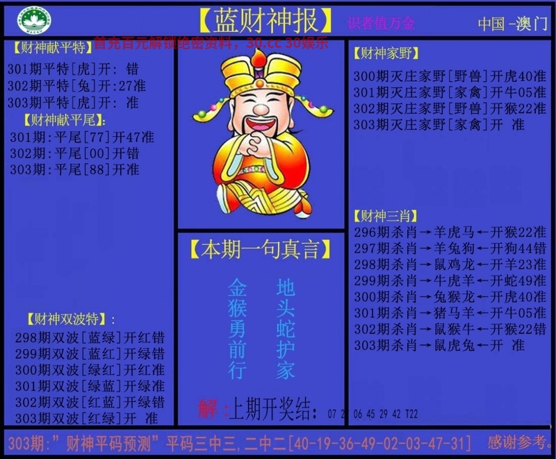 | 302期 | 虎 | 3尾 | 09合 | 猴22 |